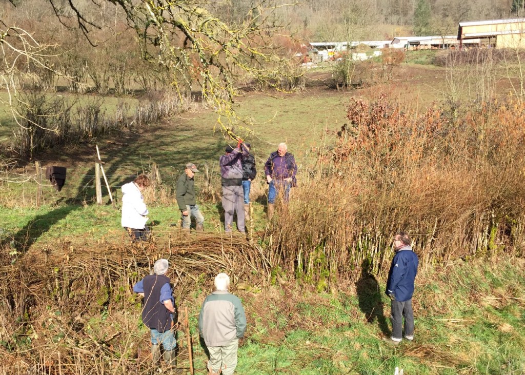 So hedge-laying has become a conservation issue, and people organise events during March throughout this Natural Park just to keep the skills alive. Yesterday I worked with neighbours to do a stretch, just for the pleasure of it. It was a convivial morning, as people who didn’t always know one another got stuck in; and this being France, the mid-morning break for bread, ham and wine was as important as the work.