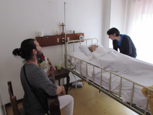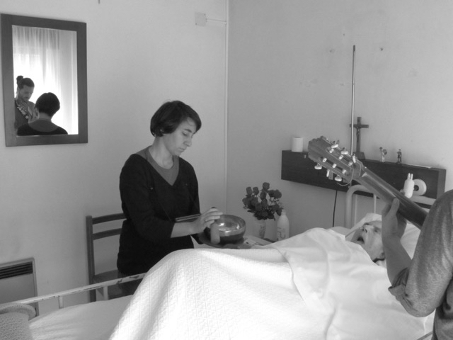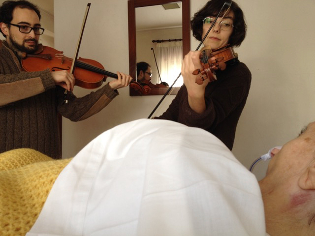 Into this space, tentatively, delicately even, artists have begun to step. In Leiria (Portugal) is the Sociedade Artística Musical dos Pousos (SAMP), a music school run by and for the local community since 1873. Its present director is Paulo Lameiro, a musician and educator of exceptional imagination. Alongside the usual programme of instrumental teaching and concerts, the orchestra, choir and swing band, he has reached out to local institutions, including the prison and the hospital. Among other work, SAMP musicians have explored how to share music with babies and the very ill. Bringing music to the dying and the bereaved grew out of that experience.