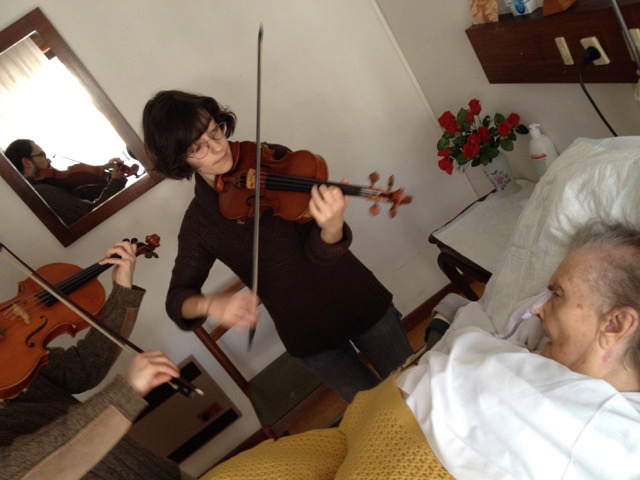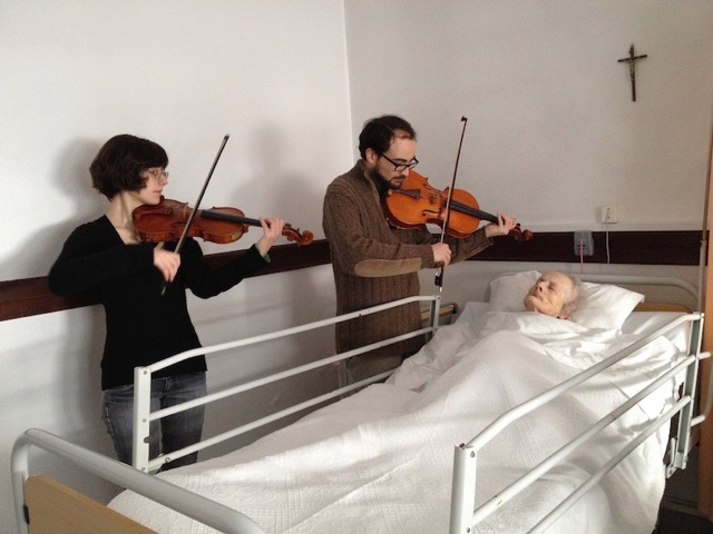 Since then, SAMP musicians have been asked to play for people at the end of life, when families have gathered for the heartbreaking moment of shutting down an incubator, and in the moments after death. The musicians have provided comfort to the dying and to the bereaved. It goes without saying that they are present at these times only at the request of the dying and the family. And just two of SAMP’s members offer this support. They have learned how to respond imaginatively to each individual, aware of that person’s relationship with music. They have learned too how to cope sensitively with the feelings in the room, not least their own. Music, familiar and loved or newly improvised, has helped mark the moment’s unique importance and support those who are living it. Like life itself, its presence is actual and meaningful. Intangible, it touches everything.