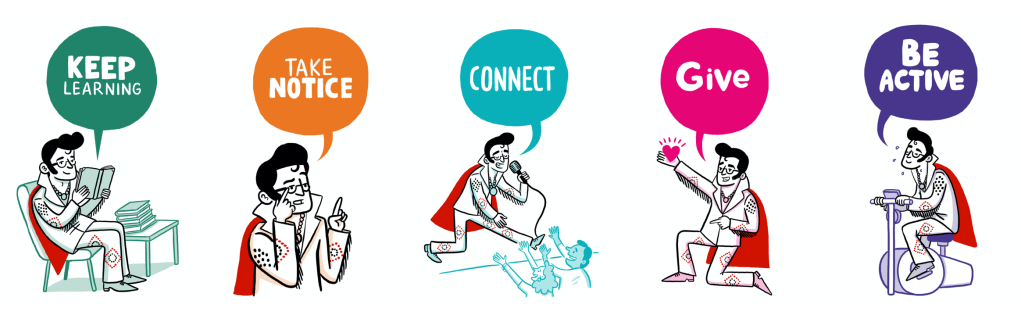 As the process evolved, other people came in to help with the things we couldn’t do ourselves. Mostly, they were friends of The Lawnmowers, part of the family of people who like working together that every artistic company gathers over time. Joel Cooper spent a day with us, imagining a visual representation for the Elvis/Paul King character who shows the characters the five ways to wellbeing.