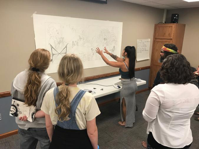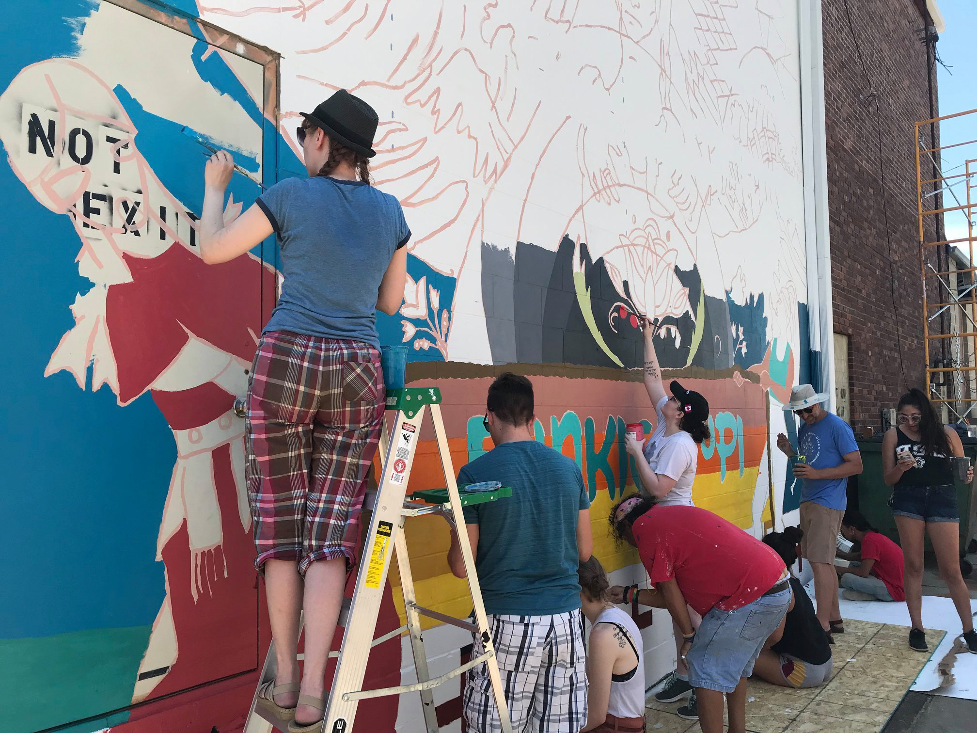 Amber Hansen and Reyna Hernandez live in Vermillion, South Dakota, a small city of about 10,000 people in the American Mid-West. Both women came to here to study at the University, where Amber is now Professor of Fine Art and Reyna works in the administration. They share a passion for murals, especially when they are created with, by and for communities. The creation of visual symbols in public space is a statement of presence and a claim of legitimacy for marginalised ideas and identities. This affirmation of voice and visibility is a form of democratic engagement. It is also a statement of respect for democracy, as the means for negotiating between competing visions of life.