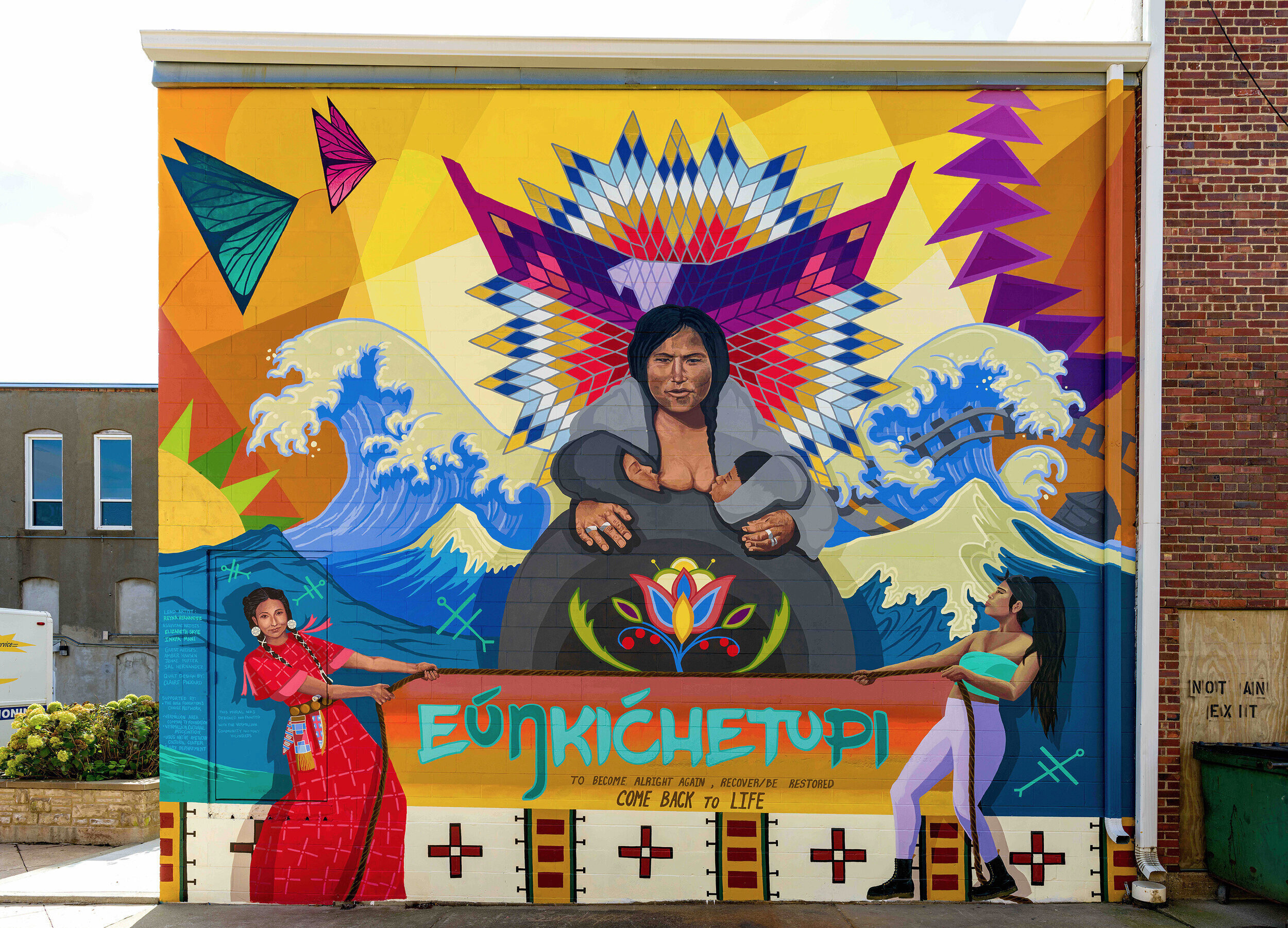 It was exciting to discover Amber and Reyna’s work, partly because such work has fallen out of fashion in Britain since I trained as a community muralist in London, 40 years ago, but also because of its exceptional quality. These photos could make it seem easy to do and to look at, but don’t be fooled. It takes great skill to design a composition that works on this scale within its surroundings. It needs to be immediately legible and attractive – after all, public space belongs to and must welcome everyone – yet still contain layers of visual richness and cultural meaning that will reward repeated viewing. Magic happens when a piece drops into place, allowing someone to really see something that they’ve looked through a hundred times. References to Lakota symbols or Beyoncé’s Lemonade, might be transparent to one person but reveal new horizons to another.