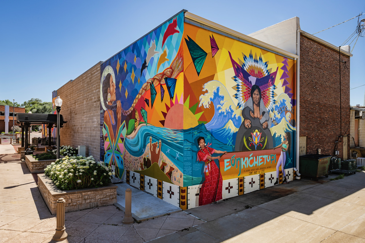 Amber Hansen and Reyna Hernandez live in Vermillion, South Dakota, a small city of about 10,000 people in the American Mid-West. Both women came to here to study at the University, where Amber is now Professor of Fine Art and Reyna works in the administration. They share a passion for murals, especially when they are created with, by and for communities. The creation of visual symbols in public space is a statement of presence and a claim of legitimacy for marginalised ideas and identities. This affirmation of voice and visibility is a form of democratic engagement. It is also a statement of respect for democracy, as the means for negotiating between competing visions of life.
