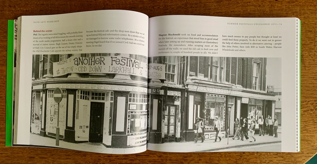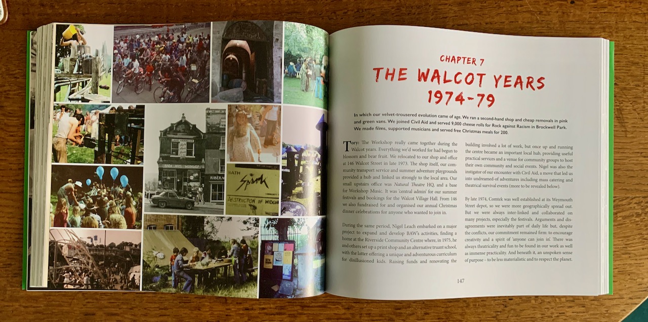 This book, for me, began in a phone call from Nigel Leach, nearly three years ago, and an invitation to come and speak at an exhibition about this pioneer community art project. The show was held at the Museum of Bath at Work (a building saved by the activists of BAW), and was the first opportunity to look back at this work after several decades. I have warm memories of meeting the people behind the project at the exhibition seminar in lost pre-pandemic days. Two years on, a book has just been published. It’s a rich. oral history with the voices of key members and many other people who contributed to, enjoyed and remember Bath Arts Workshop. It’s big, too, full of photos, posters and drawings, telling an important story, not just about Bath but the history of those times when so much of our present culture was reimagined. And the progressive spirit that animated the workshop continues: