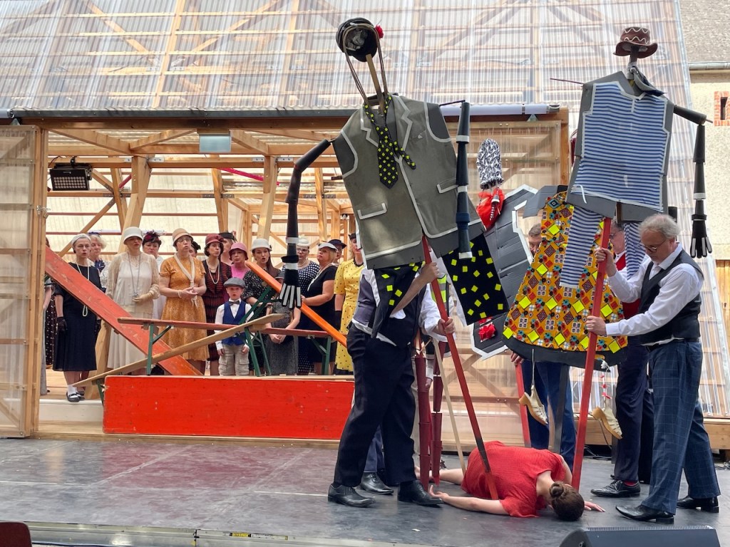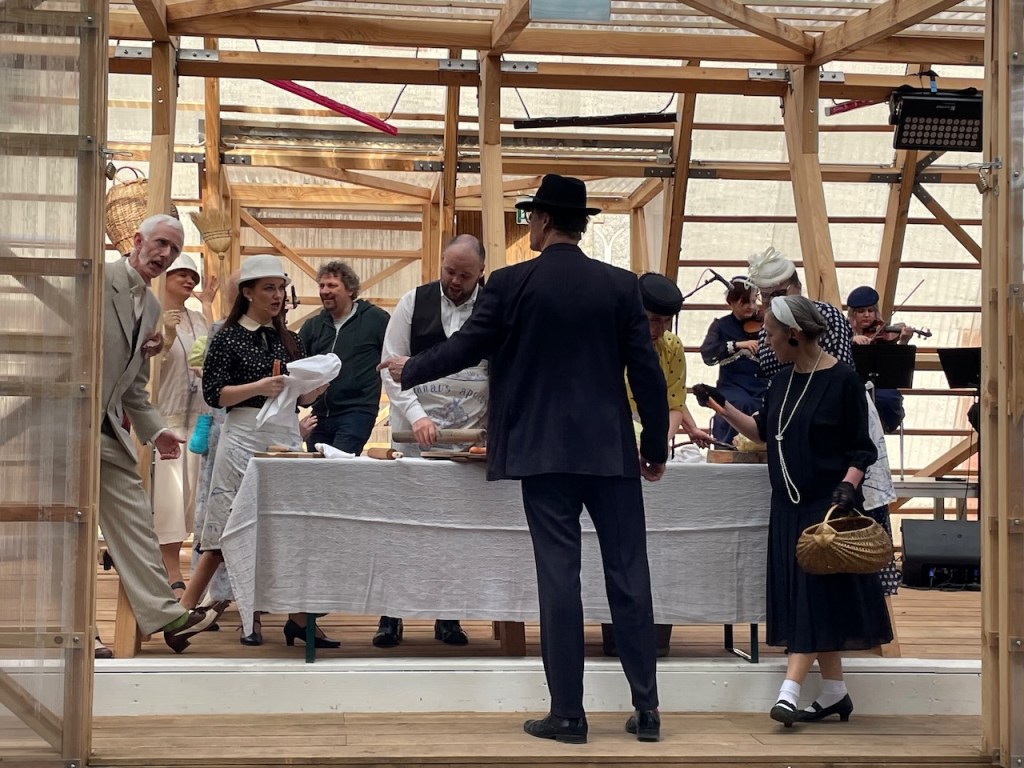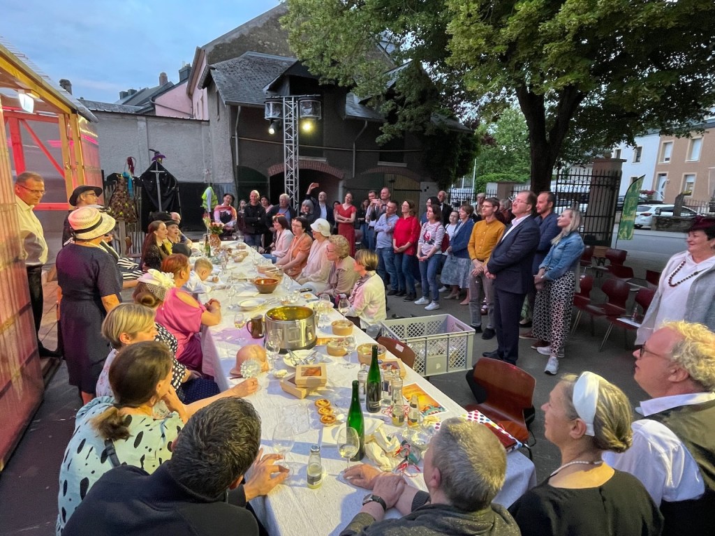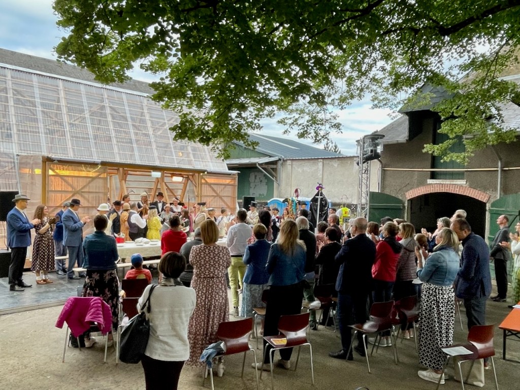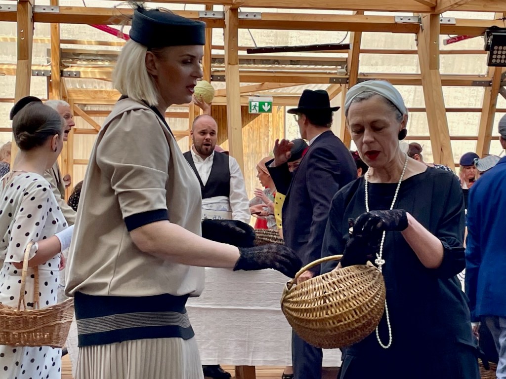 The performance took place outdoors, on a temporary stage under lime trees in Differdange. Passers-by stopped to watch from the street, captivated by the gorgeous singing. Some came to join the crowd in the courtyard. At the end of the 50 minute performance, the audience was invited to join the cast for a bowl of cabbage soup, with dark fennel bread and local wine. The Cabbage Field is a piece of open land that local people have been defending for years, and it has become an icon of the community’s vision for its future, so the soup was both nourishing and symbolic. The celebration continued as the light faded, in happy communion. Late in the evening, some of the cast sang Lithuania’s national anthem, full of love and longing for a peaceful land of waving wheat fields.