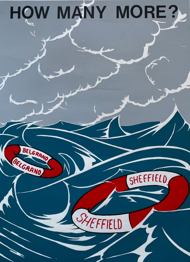 The image above is a detail from this poster I made during the Falklands War. A couple of friends and I flyposted one night in south London. There were two versions,: this, which my friends liked, and another with the words ‘BRING IN THE UN’ at the bottom which I preferred. I’d read John Berger on Don McCullin’s Vietnam War photographs, and believed that art which spoke of wrongs needed to offer responses; today, I’m not so sure.